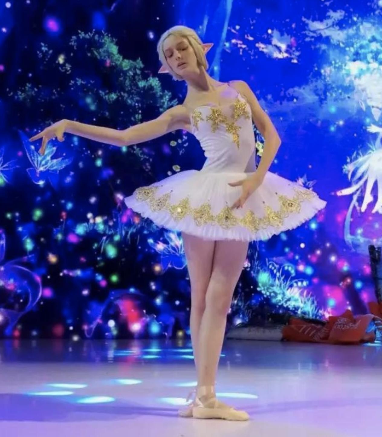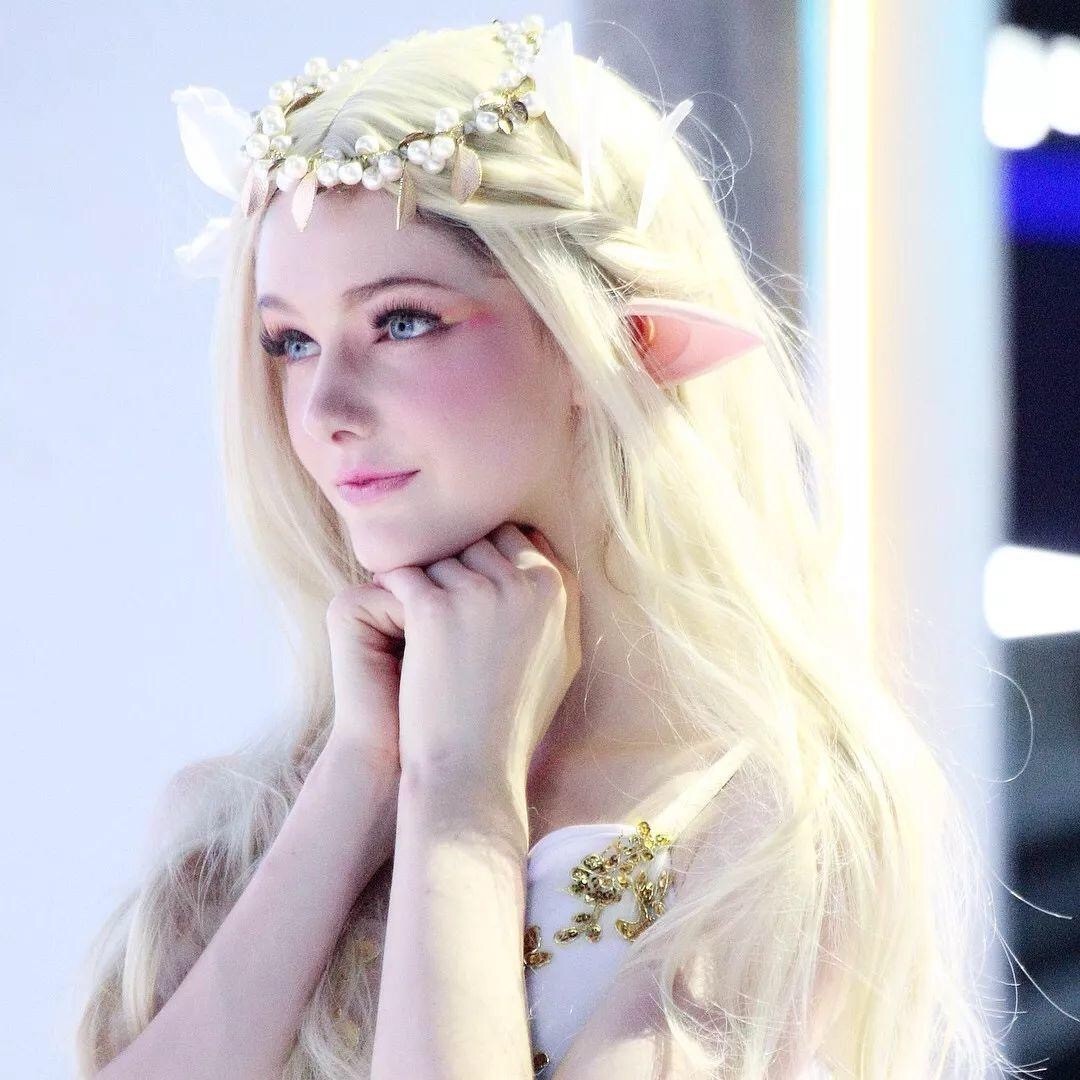 也就是说原装真人甚至于比照片视频中的更加好看!金色的头发配上了精灵耳朵,再来一件白色的吊带衣服,完美的身材比例让她看起来非常的魅惑众人,而又带着一种精灵的纯粹美感。