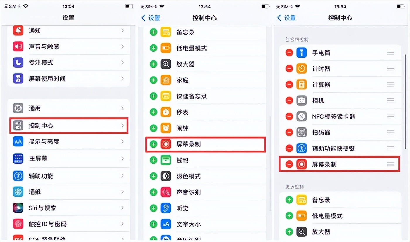 第2步:在控制中心页面,找到“屏幕录制”选项,点击旁边绿色的“+”按钮将其添加到控制中心。