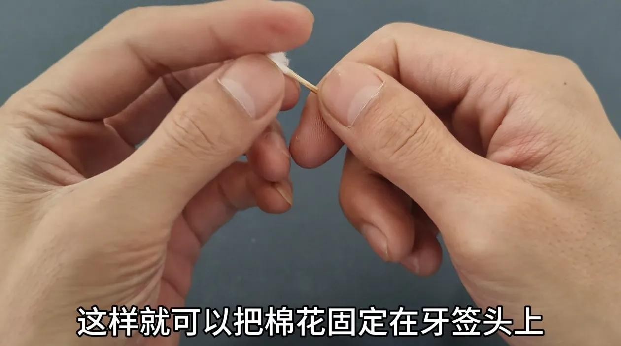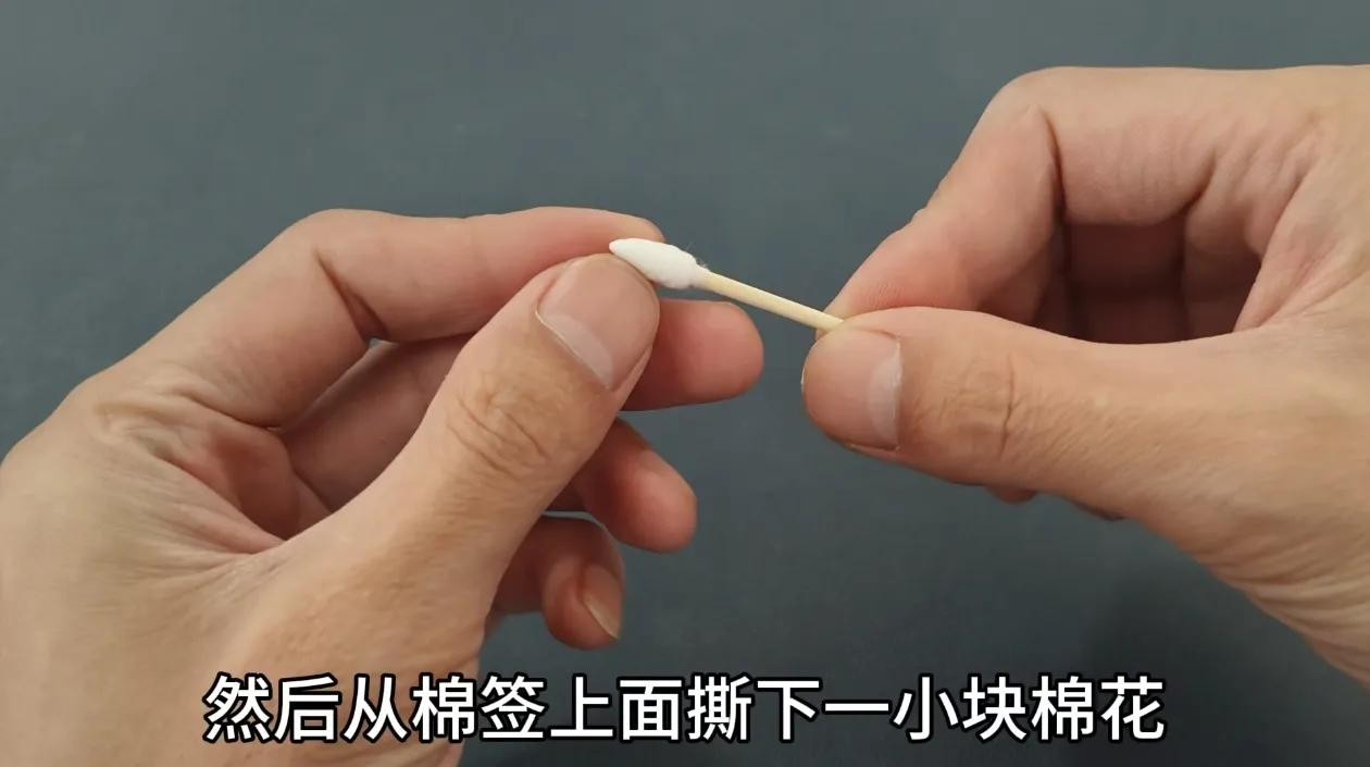 因此我们可以用牙签,先把里面的脏东西给它挑出,而如果里面灰尘太多,应该怎么处理呢,其实也是非常的简单,咱们只需要准备一根棉签,然后从棉签上面撕下一小块棉花,不需要太多哟,只需要撕上这么一小撮即可。