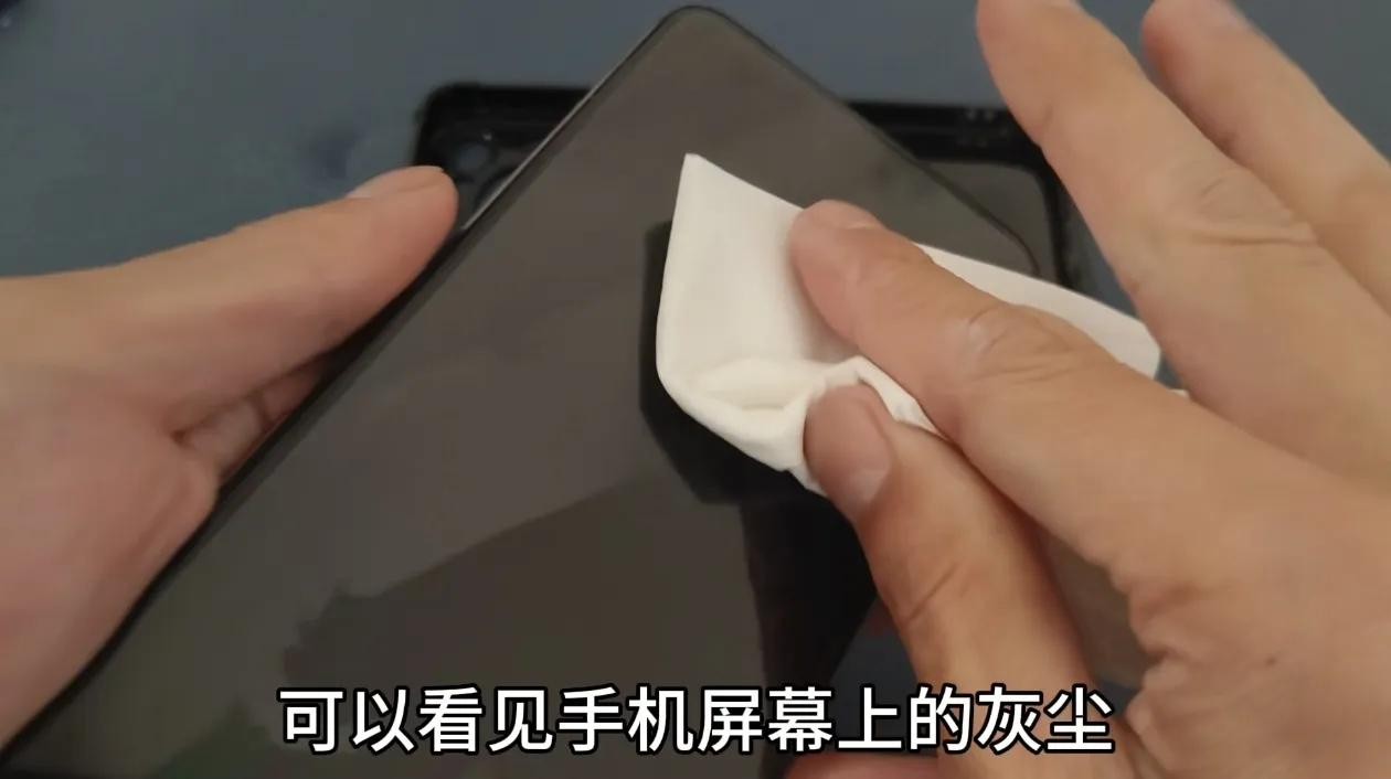 这里只需要在手机屏幕上喷上一些酒精,手机壳也喷上一点酒精,因为酒精它挥发性特别强,无论用它来擦拭手机屏幕,这清理手机充电口都不用担心损害手机,最后用纸巾把手机屏幕上轻轻的擦拭一下,可以看见手机屏幕上的灰尘以及渣子残留,已经被清理的非常干净了。