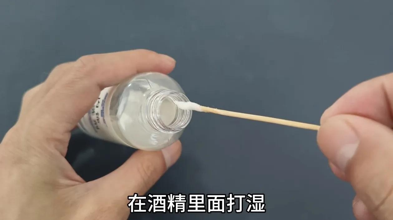 棉花固定好以后找上家里面的酒精,把酒精拧开,然后将套上棉花的牙签在酒精里面打湿,差不多这样就可以了,最后用泡好酒精的牙签儿。
