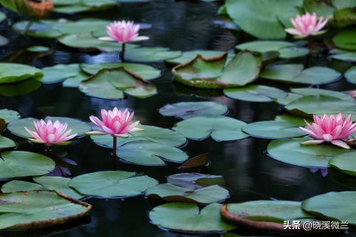 路边的水塘里,荷花依旧袅袅婷婷,莲蓬头也渐渐多了起来,水塘另一边的睡莲,似乎刚刚进入盛花期,开得十分繁茂。