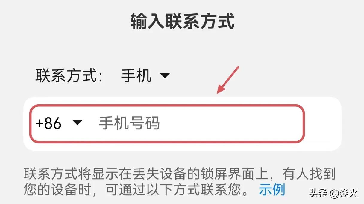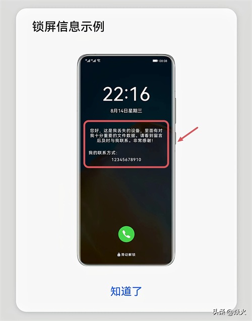 这样就把手机给锁定了,对方如果捡到以后,他开机之后,在锁屏状态下会是这样的一个提示,显示你的留言信息以及联系方式。(如下图所示)