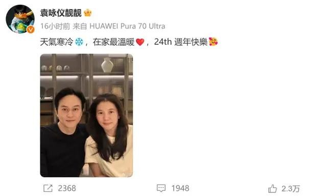 2月8日,袁咏仪晒合照庆祝与张智霖结婚24周年:“天气寒冷,在家最温暖。”画面中二人素颜出镜,但状态依旧年轻,甜蜜温馨。