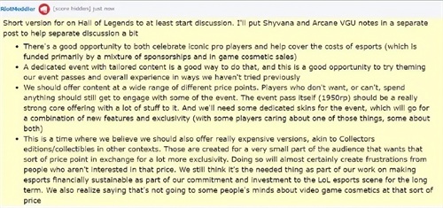 对于昂贵皮肤价格版本的解释,拳头认为这些皮肤类似于收藏品,提供给少数希望用高价格换取更多独特性的玩家。尽管这么做会令其他一些玩家对价格不满,但拳头认为这是他们为了让电竞在商业上延续所必须要做到的事,这也是拳头对LOL电竞长期承诺和投资的一部分。即便如此,拳头依旧认为不能改变那些玩家们对昂贵皮肤的看法。