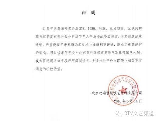 不久后,制作人王兵也晒出李易峰的朋友圈:“一大早的,干嘛呢!”疑似回应对于自己吸毒被抓的传闻。同时,李易峰经纪公司也发了法律声明,希望造谣的博主们删除文章。
