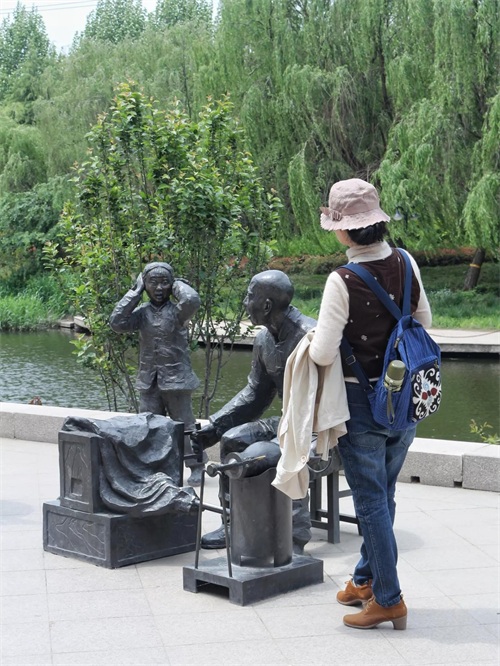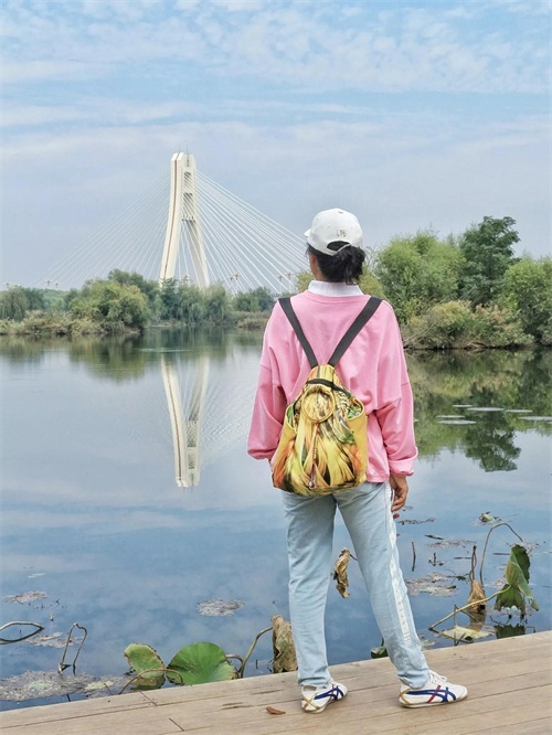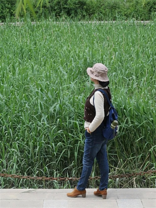 她的背影照颇具故事感,看到照片会给人许多遐想。当她站在河边抬头远望时,会让人感觉她很自豪,天水相接中傲立的彩虹桥是家乡的骄傲。当她观察趣味雕塑时,会让人感觉她想起了童年,那香甜的曝米花曾经是孩提时代的心头之好。当她站在满目翠绿的芦苇丛旁,会让人感觉她正想象那绝美的满塘芦花随风搖曳的盛况。