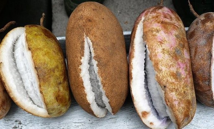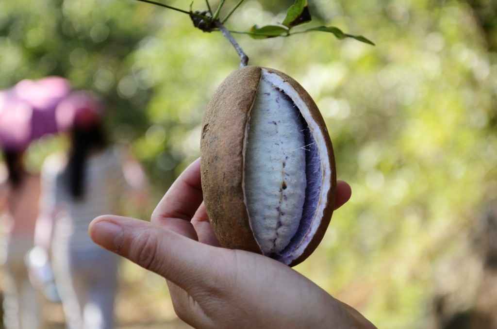 八月楂,学名预知子,又名 八月炸、八月扎、八月瓜、野香蕉、狗腰子等,为木通科植物木通Akebia Quinata (Thunb)Decne.的果实。果实成熟期为农历八月,果提似猕猴桃,但比猕猴桃长,略似香蕉。成熟后,果皮开裂,可以像香蕉般剥开,其果肉呈雪白色,果肉内均匀分散着黑色种子,似黑芝麻。果肉及种子可食用,味甘甜,味道十分独特,具有极大开发价值。