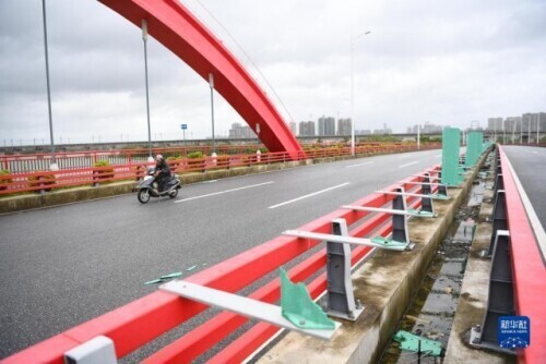 8月25日,在广东阳江市漠阳江东河大桥,一些护栏被台风损坏。
