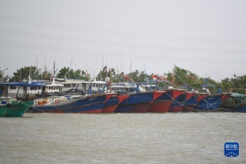 8月25日,广东阳江市对岸渔港停泊着回港避风的渔船。