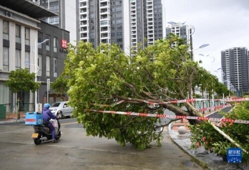8月25日,在广东阳江市石湾路路口,快递员从倒伏的树木旁驶过。
