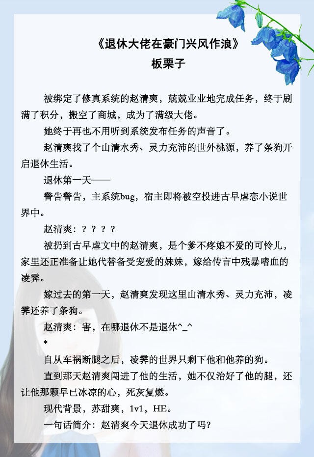 短评:穿书豪门现言,女主是修真大佬,自带系统,准备退休悠闲度日时,系统出现bug,将女主送到古早虐恋小说世界中,成了被虐得惨兮兮的原女主。原主容貌被毁,不被生母喜爱,还被妹妹抢了男朋友,在男主车祸断腿失去继承权后,被迫代替妹妹出嫁,和男主开始一系列虐身虐心的情节,最后死翘翘。