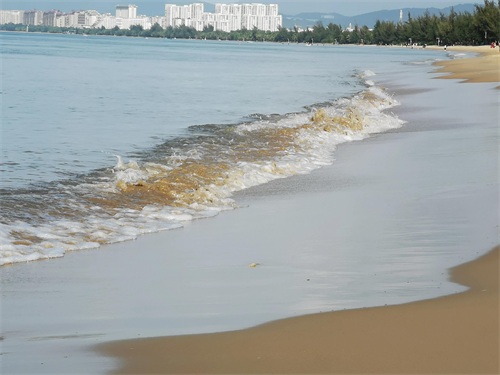 三亚湾之美,还美在海水。海水的颜色是变幻莫测的,在海边看是蓝色的,到海里看却是墨绿色的。近处的海水清澈见底,小鱼虾、小螃蟹和小海螺清晰可见。孩子们在浅水中追逐嬉水,激起朵朵白色浪花;大人们则在海边尽享海天一色带来的欢乐。
