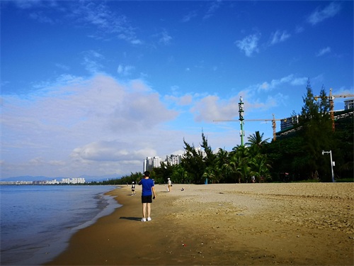 三亚湾之美,美在沙滩。这里的沙子既洁净又柔软,想用手抓住很困难,赤脚趟踩感觉很舒适。三三两两漫步在沙滩上的人们,举目眺望眼前无际的湛蓝大海,心胸也顿觉开阔起来,昔日的烦恼都被忘得一干二净。