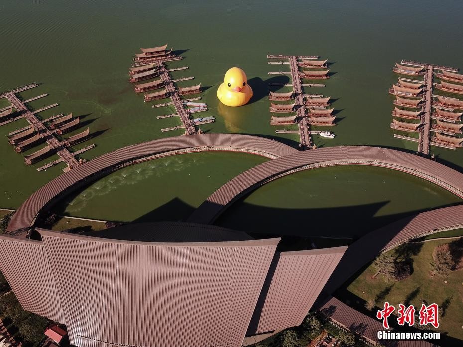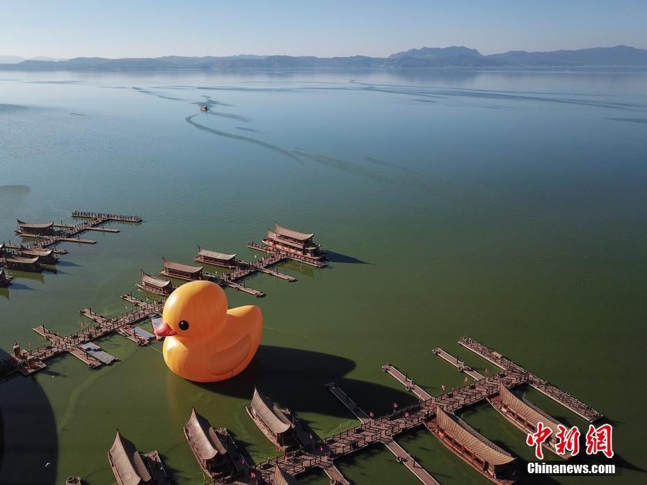 “大黄鸭”在昆明滇池停靠。 中新社记者任东摄