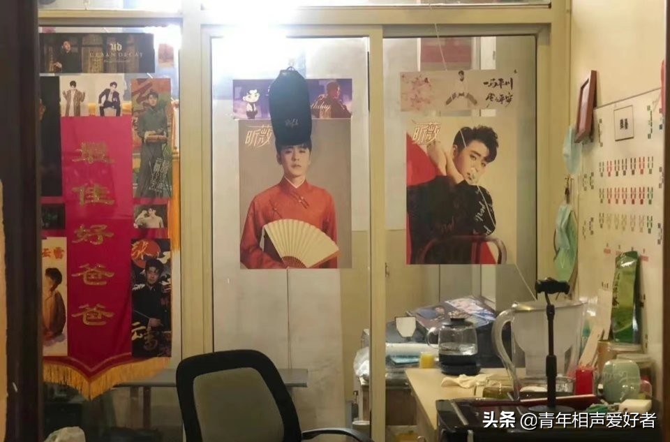 张云雷爸爸的办公室不大,有一张桌子和椅子,桌子上面的墙上,贴了一张南京德云社的座位表。除了这些必备品以外,墙上贴满了张云雷的照片和海报,大大小小琳琅满目。有的是张云雷拍的杂志,有的是粉丝拍的照片,有拿扇子的,有穿便服的,还有唱大鼓的,而最让大家觉得好玩的,是墙上挂的锦旗。