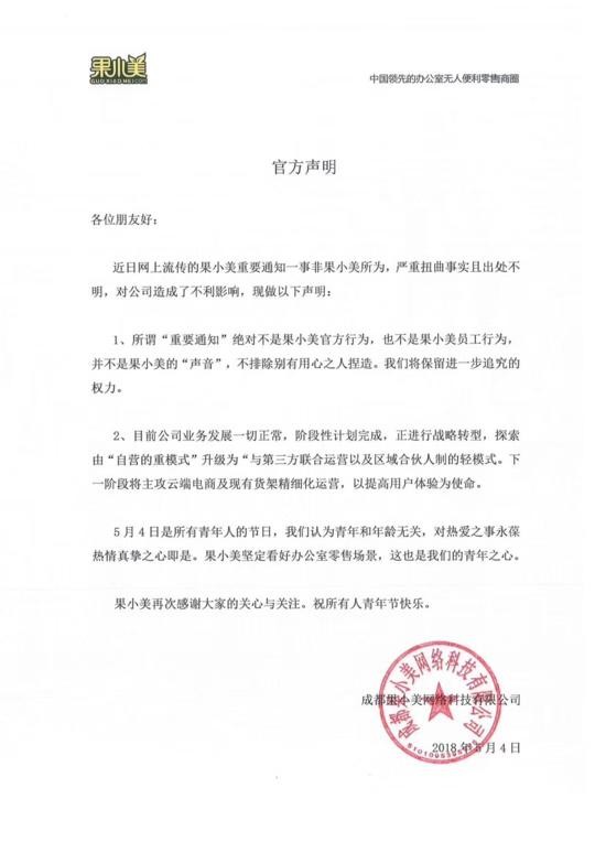 对此,果小美随后发布官方声明表示,近日网上流传的果小美重要通知一事非果小美所为,严重扭由事实且出处不明,对公司造成了不利影响,现做以下声明: