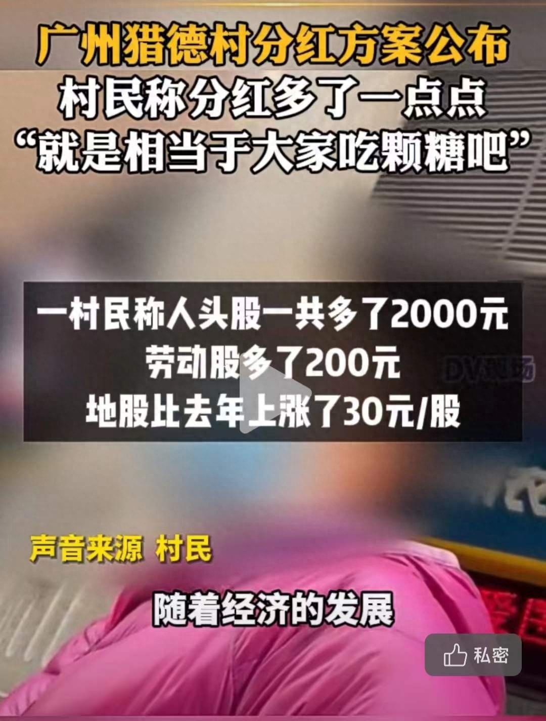 一位村民阿姨称,她的人头股一共多了2000元,劳动股多了200元,地股比去年上涨了30元/股,并低调表示村民分红只是多了一点点,相当于大家都吃了一颗糖。