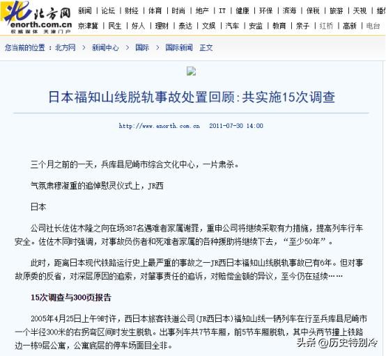 2、原文登载于北方网2011年7月30日:《日本福知山线脱轨事故处置回顾:共实施15次调查》
