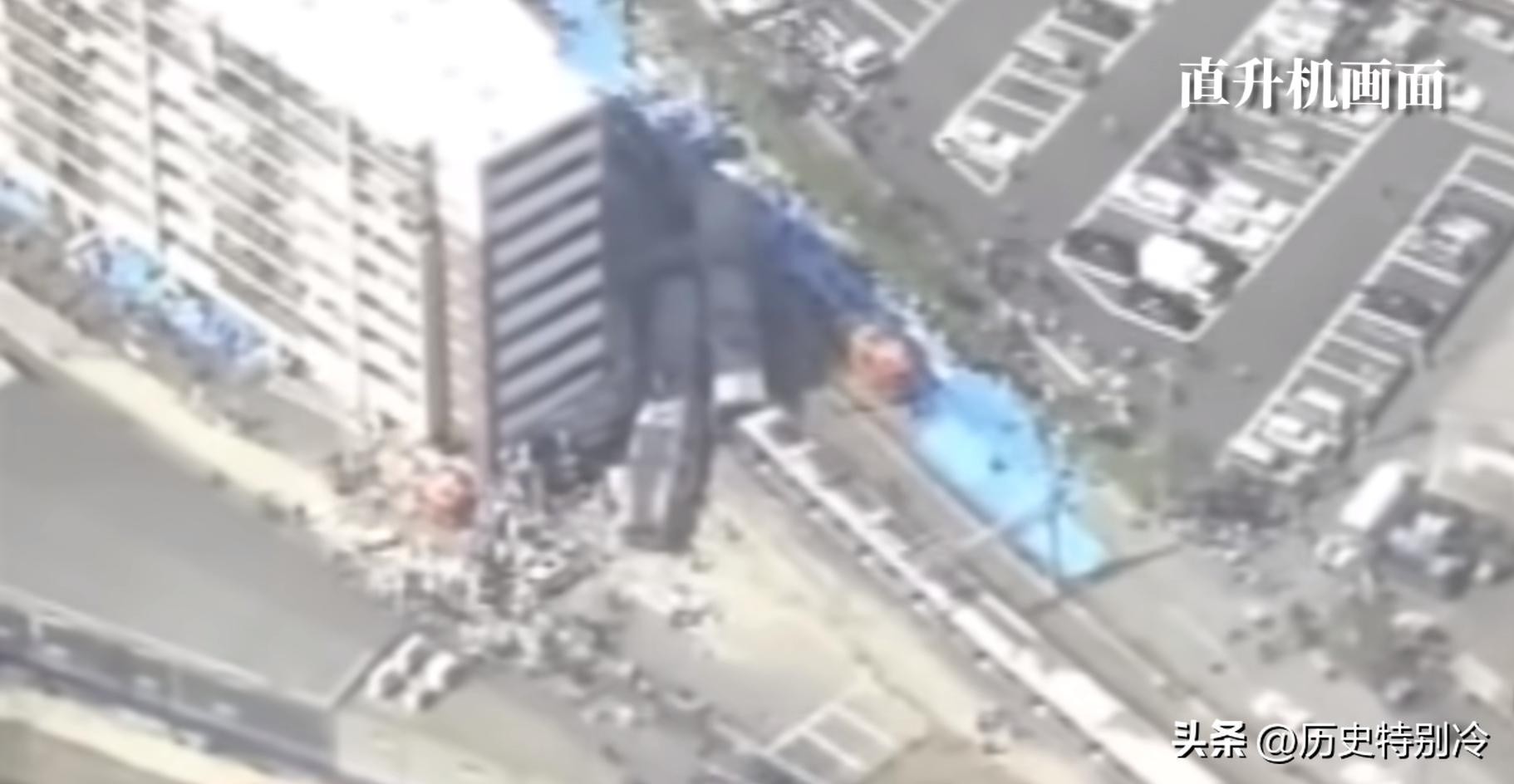 直升机在空中拍摄到,本该在轨道上的5418M号列车,此时已经全部脱离了轨道,“瘫倒”在一栋大楼的附近。
