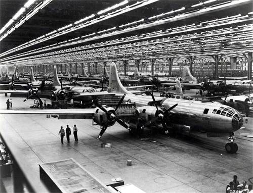 事实上,为了应付大量订单,B-29的生产分别由波音公司、贝尔飞机、马丁飞机的工厂负责。此外数以千计的承包商,包括通用汽车,负责制造各种配件。其中波音公司在肯萨斯州的B-29工厂规模最大,在当地雇用了接近三万名工人,日夜不停生产。