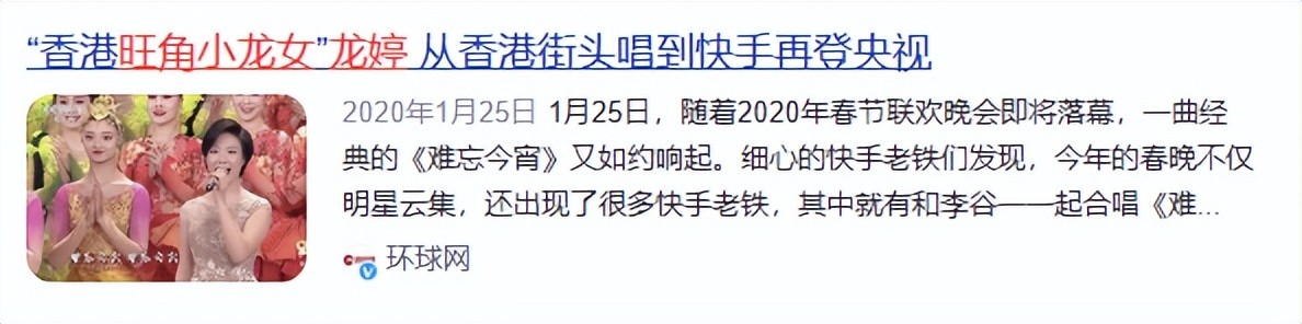 资料参考:2020-01-25环球网——“香港旺角小龙女”龙婷 从香港街头唱到快手再登央视