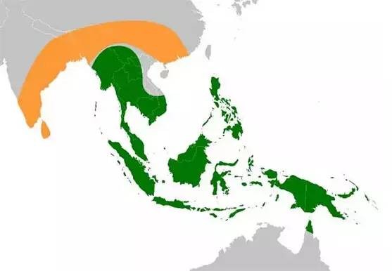 小果野芭蕉和野蕉的地理分布;绿色代表小果野芭蕉;橙色代表野蕉。