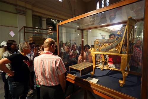 5月16日,人们在位于埃及首都开罗的埃及博物馆参观古埃及法老图坦卡蒙的木制镀金宝座。 新华社记者 隋先凯 摄