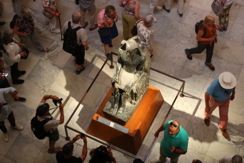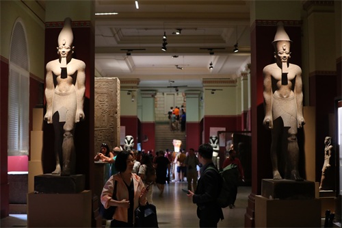 5月16日,在位于埃及首都开罗的埃及博物馆,人们走过古埃及法老门图荷太普二世的坐像。 新华社记者 隋先凯 摄