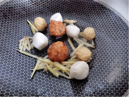 3. 我们在锅中加入适量的食用油,然后等油温渐渐变高的时候,先将切好的姜丝下入锅中爆香,然后我们将已经解冻的丸子也一起下到锅中。
