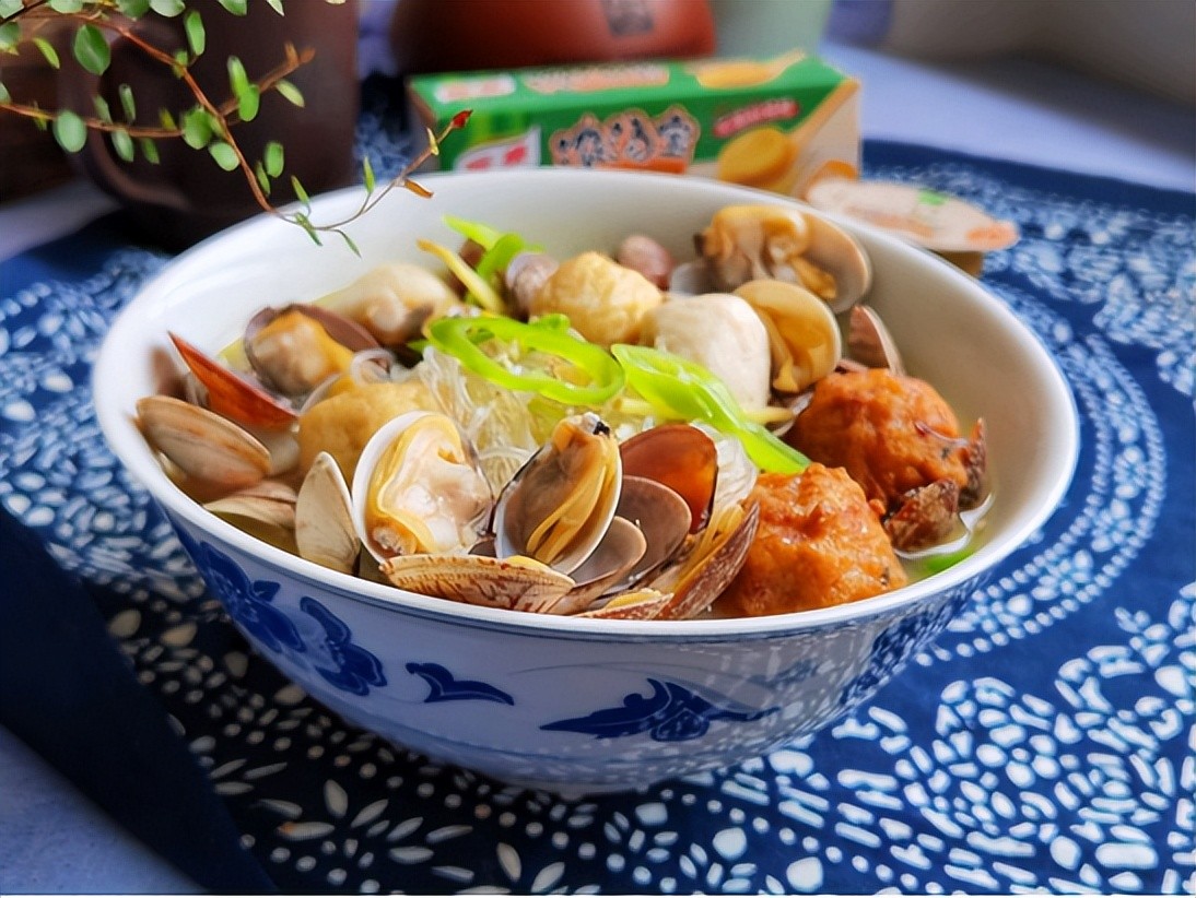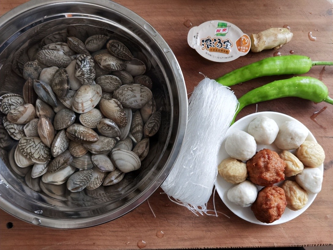 【所需食材】:花蛤500g、绿豆粉丝一小把、鱼丸肉丸数个、老姜一块、青椒两个、浓汤宝一块、菜籽油适量、料酒适量