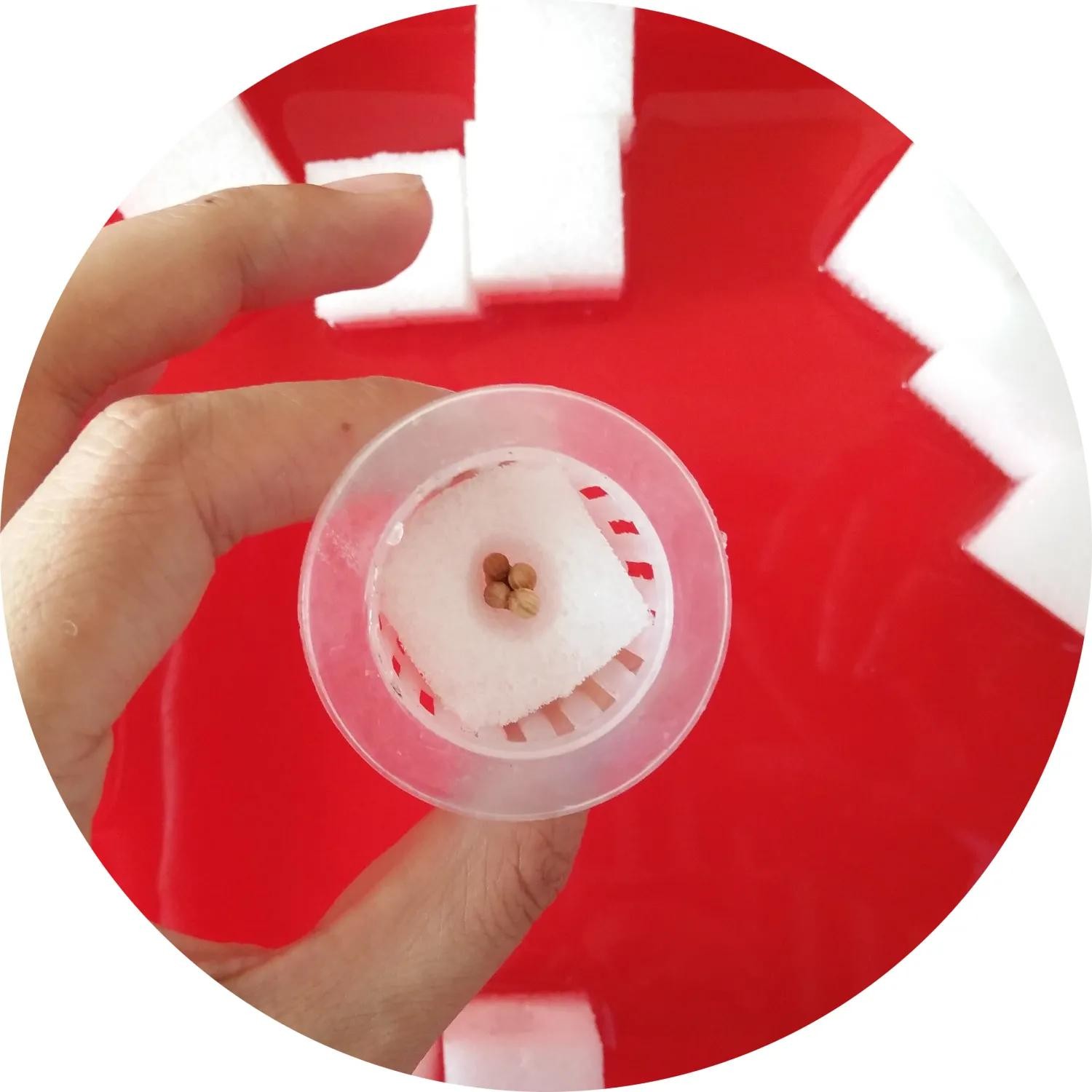 3、播种,将需要种植的蔬菜种子种于海绵中间的凹槽中,尽量放于凹槽最底部使种子能接触到水。一般一个定植杯种2粒种子,个别品种如芫荽、芝麻菜等需种4-6粒种子。