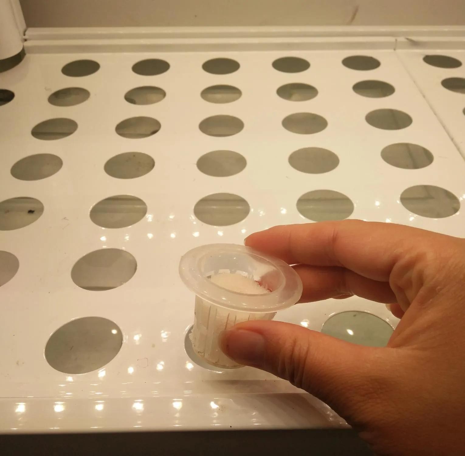 2、海绵放入定植杯,将浸泡后的海绵用镊子夹着放入定植杯中,注意将海绵带凹槽的一面朝上放置,海绵的底部要充分的接触定植杯的底部。