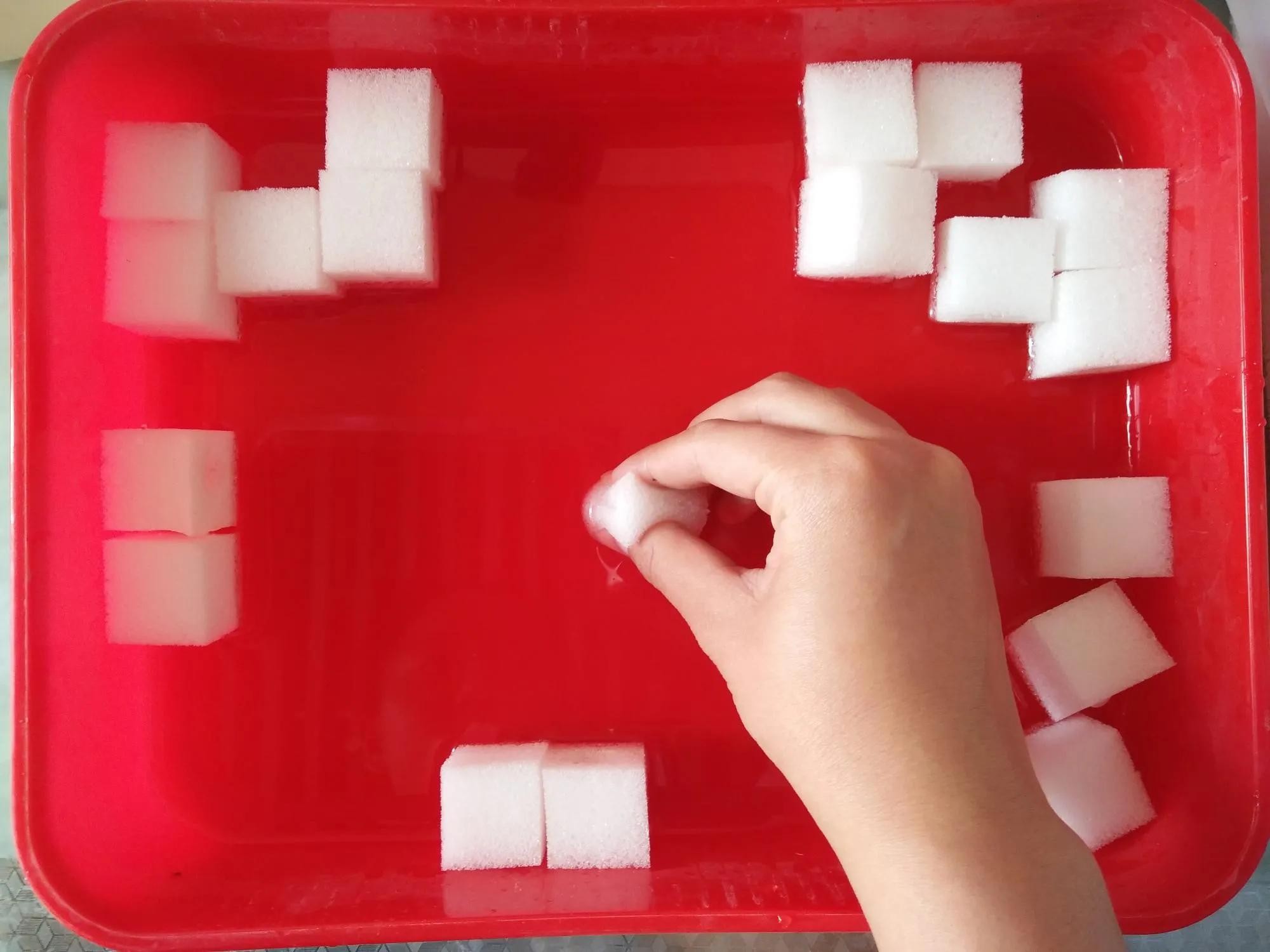 1、浸泡海绵,将海绵撕成小块浸泡在水中,使海绵充分的吸足水分,在浸泡过程中可以挤压海绵排出海绵中空气,加快海绵的吸水速度。