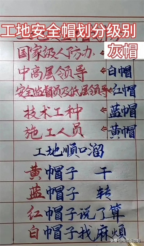 工地安全帽顺口溜,黄帽子干,绿帽子转,红帽子说了算,精辟!
