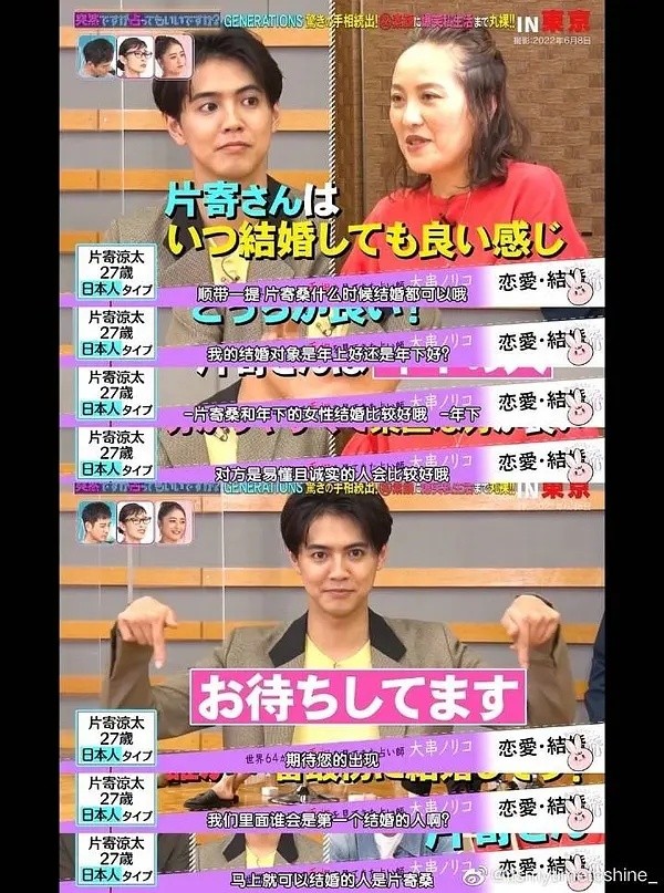 但其实两人的事情也是有迹可循,在一档节目中,占卜师提到片寄凉太的结婚对象是年下和对方易懂且诚实等方面时,片寄凉太的嘴角扬起想要刻意压下去却压不住,看得出来是很开心了。