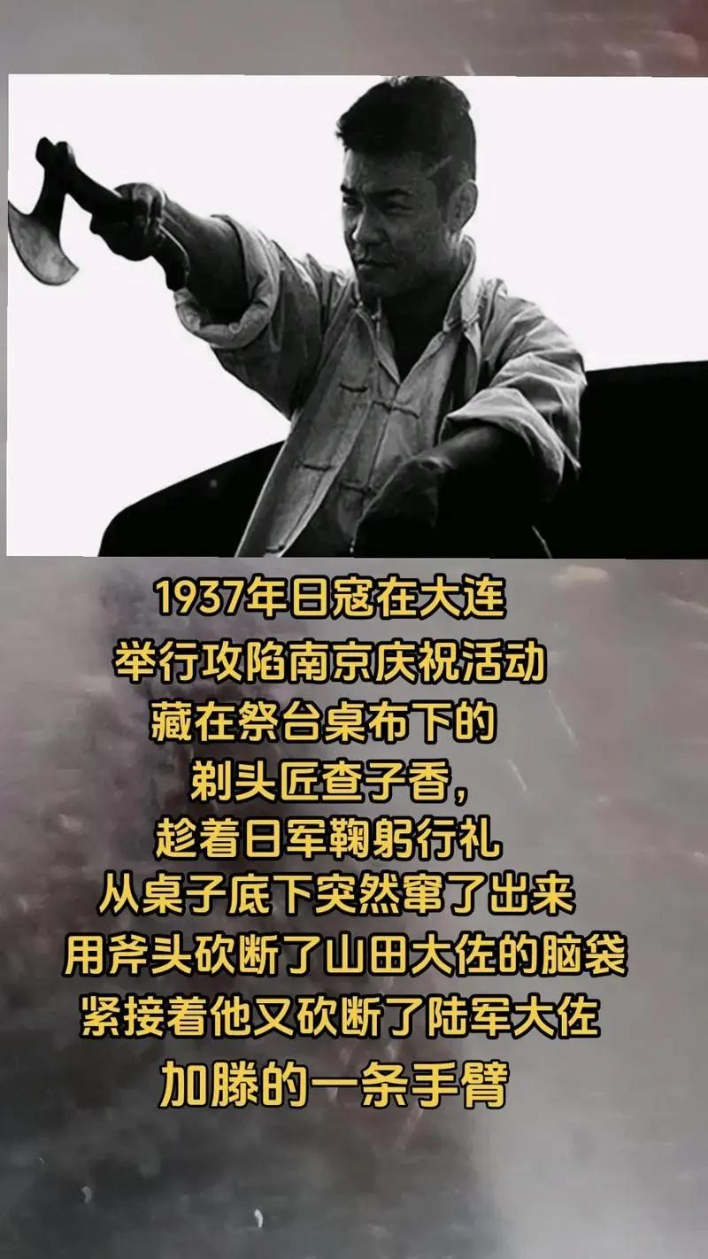 终于,一个挂着勋章的日本军官大摇大摆地走到祭台前,那副得意的样子,看了就让人生气。查子香瞅准这个机会,一点都没犹豫就出手了。他像一道闪电似的,很快抽出斧头,用尽全身的力气,朝着那军官的脖子砍了下去。只听“咔嚓”一声,那军官的脑袋就被砍了下来,鲜血像喷泉一样喷得到处都是。这一下,周围的人都吓傻了,现场乱成一团。