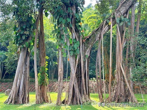 树干布满无数块状根系,有36条大小不等的气生根,垂直而下、相互交缠、盘于根部、紧紧抓住大地,形成根部相连的丛生状支柱根。这种根盘根、枝连枝,盘根错节的硕大整体,宛如一片小树林,是热带雨林中的一大奇特景观。