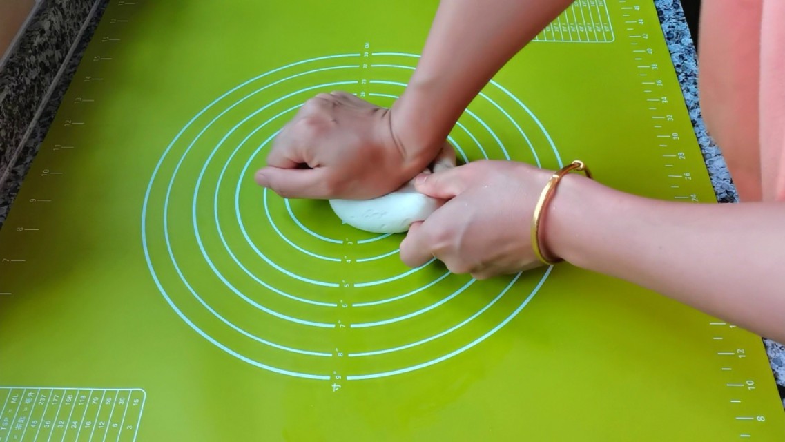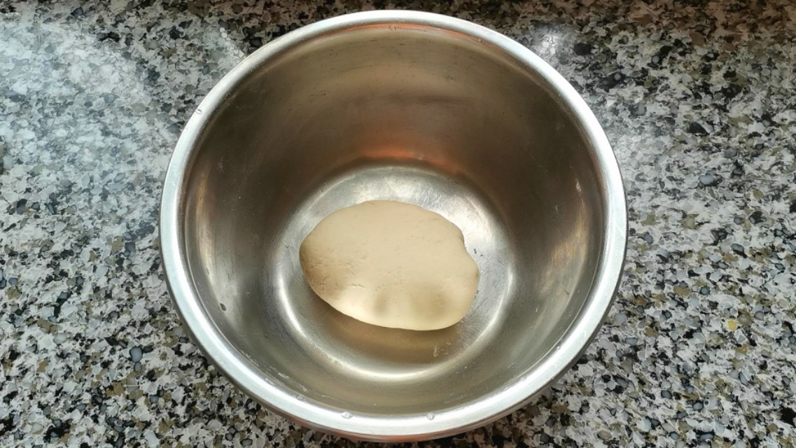 1,80克高筋面粉中加30克低筋面粉,加1.5克盐、2.5克白糖、2.5克酵母、10克玉米油,少量多次加60克温水,搅拌均匀,揉成光滑的面团,盖上盖子醒发。