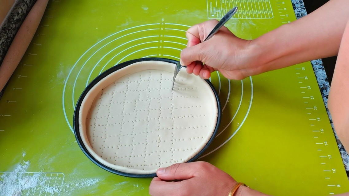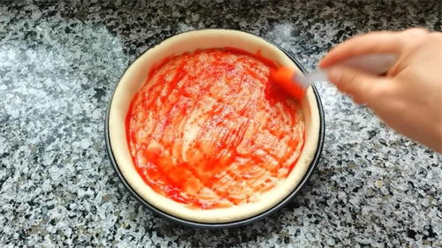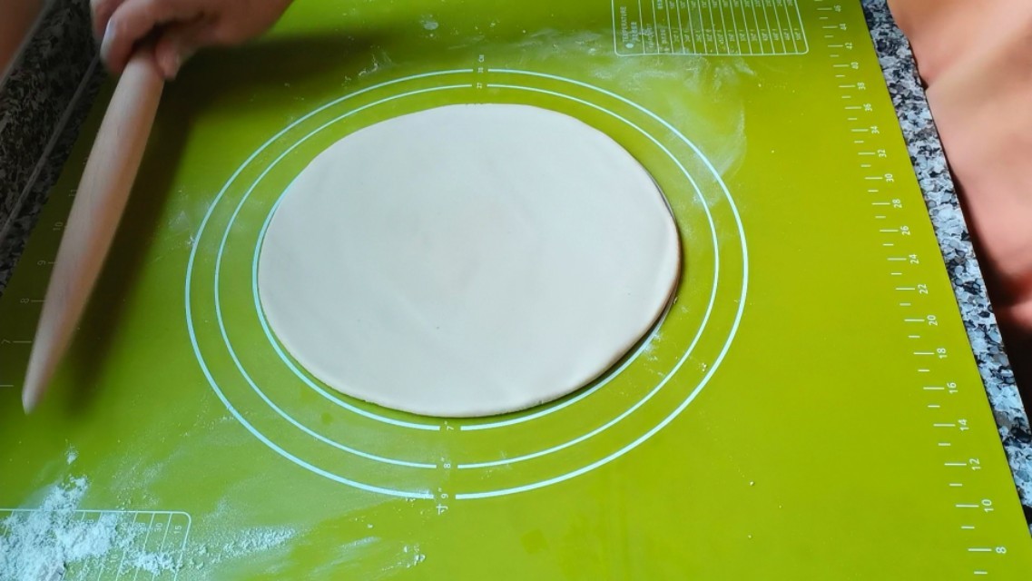 (我家披萨盘是八寸,饼坯擀成直径是23厘米就可以,比披萨盘稍微大一点就行。)