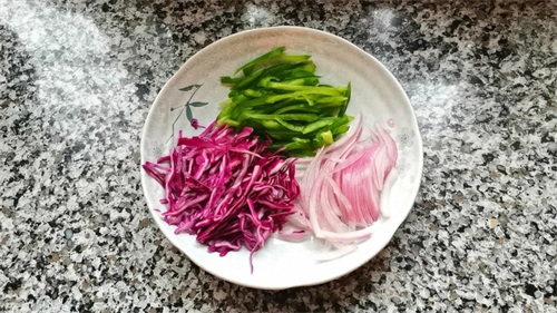 2,切点紫甘蓝、青椒和洋葱丝备用。洗净的猪肉切丝,加适量姜丝,盐、鸡精、生抽、13香拌匀腌制10分钟。也可以准备点你喜欢的配菜肉类或者做成水分少点的水果披萨都行。