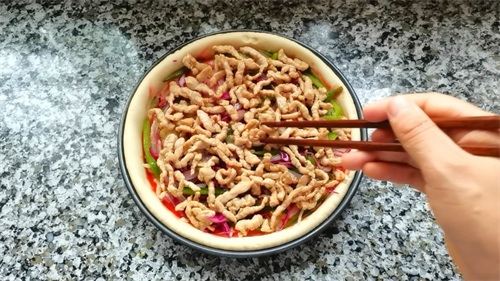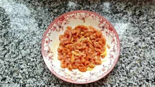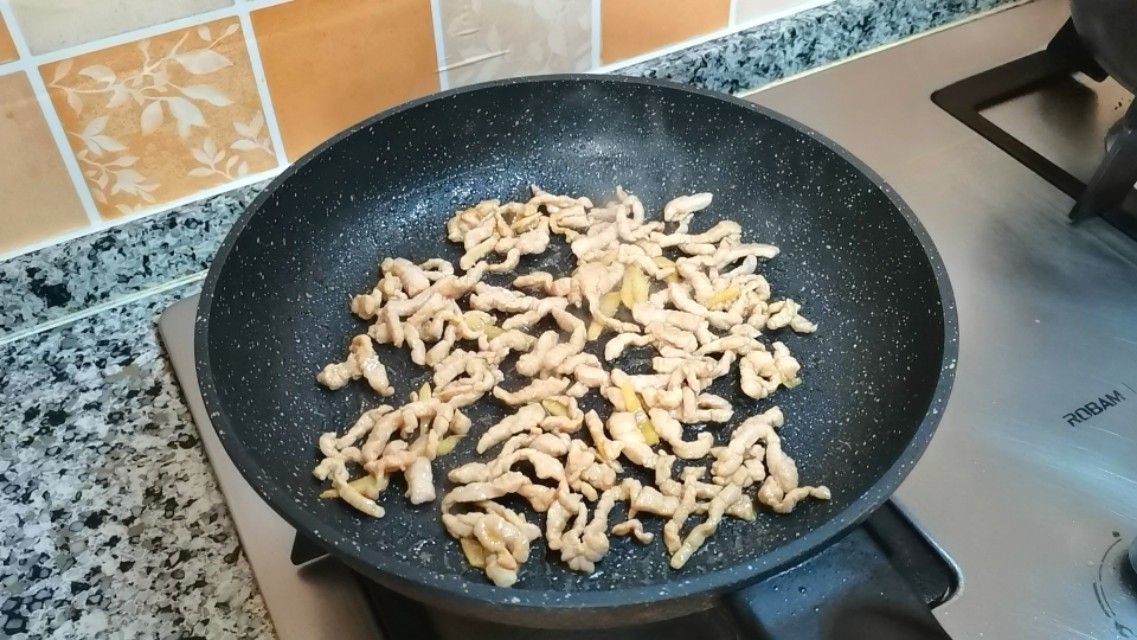 3,10分钟后,锅里加适量油,倒入肉丝炒至变色,盛出来备用。