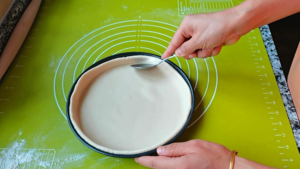 5,披萨盘底部和内壁四周都刷一层食用油,放入饼坯,稍微的整理下,用勺子整成披萨形,再用叉子扎些小孔,方便排气。