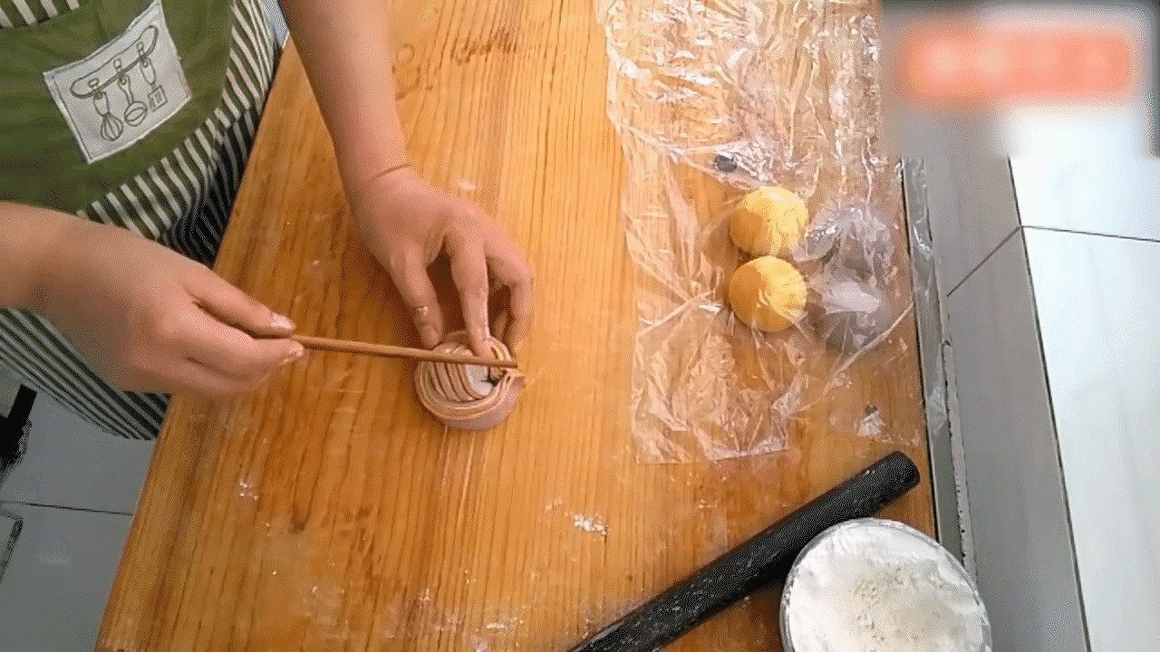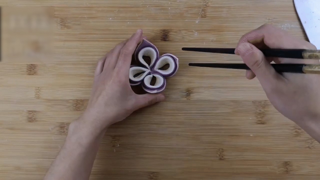 4.用筷子把对角用力夹一下,另一个对角同样操作。