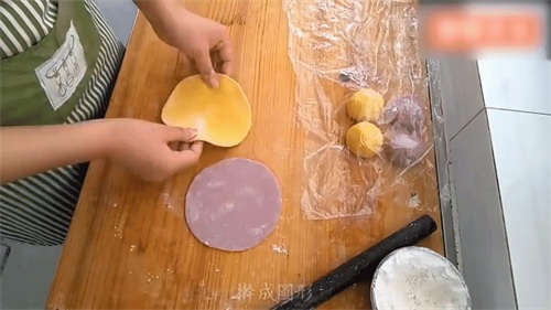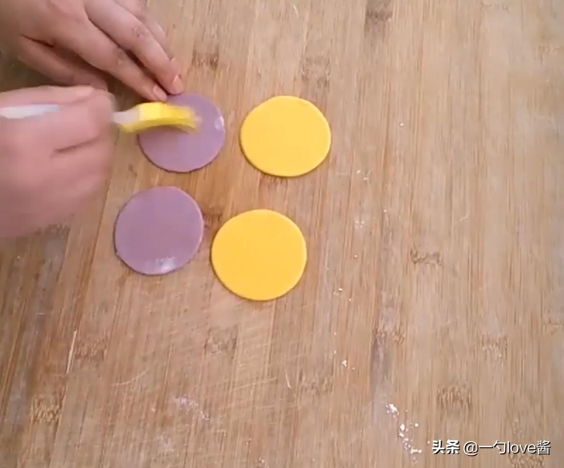 2.将两种颜色的剂子搓成球状后擀成圆形(也可用一大一小两个杯子,用杯子口将面片按压成圆形),白色面片放在紫色下面。