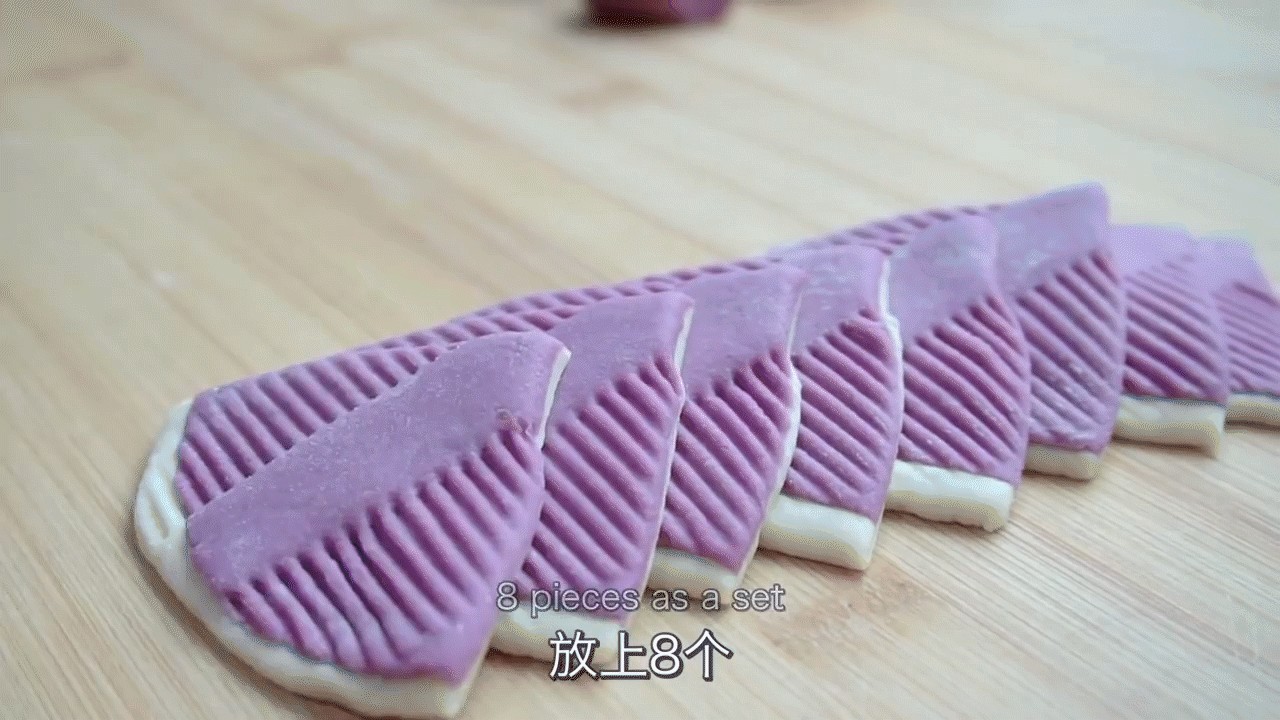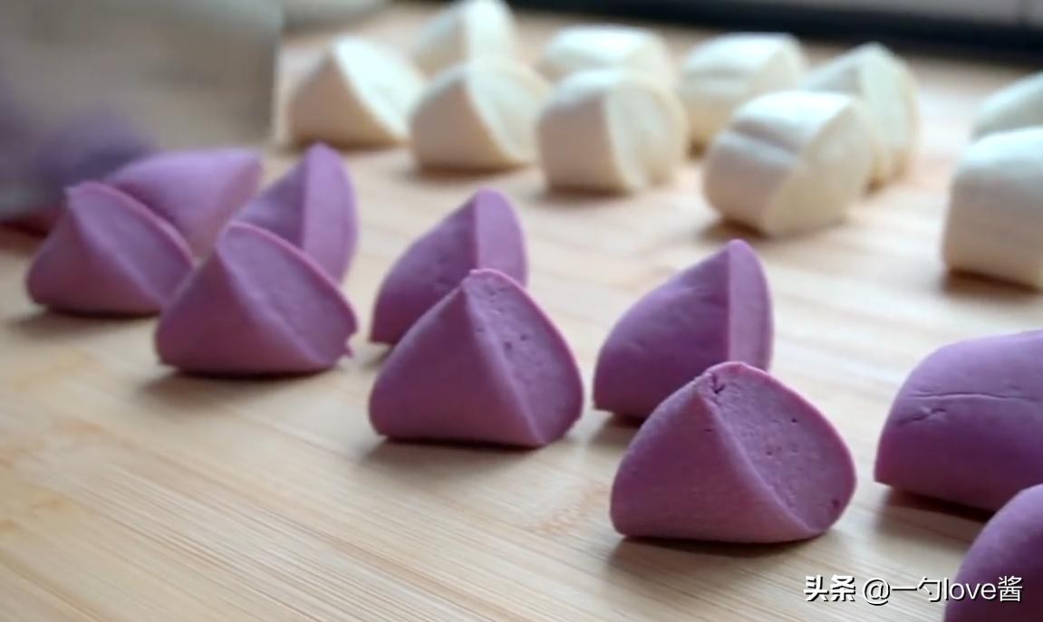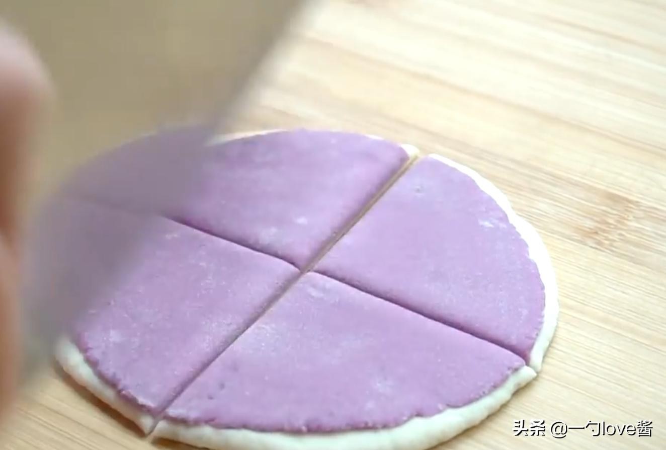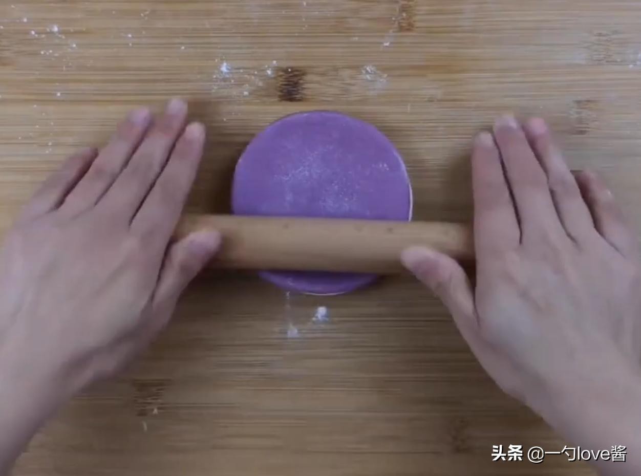 做法:1.将白色和紫色面团擀成同样大小的圆形面片。