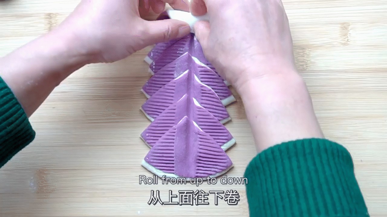 6.这里注意,要从铺在最下层的面片开始,从上往下慢慢卷起来。