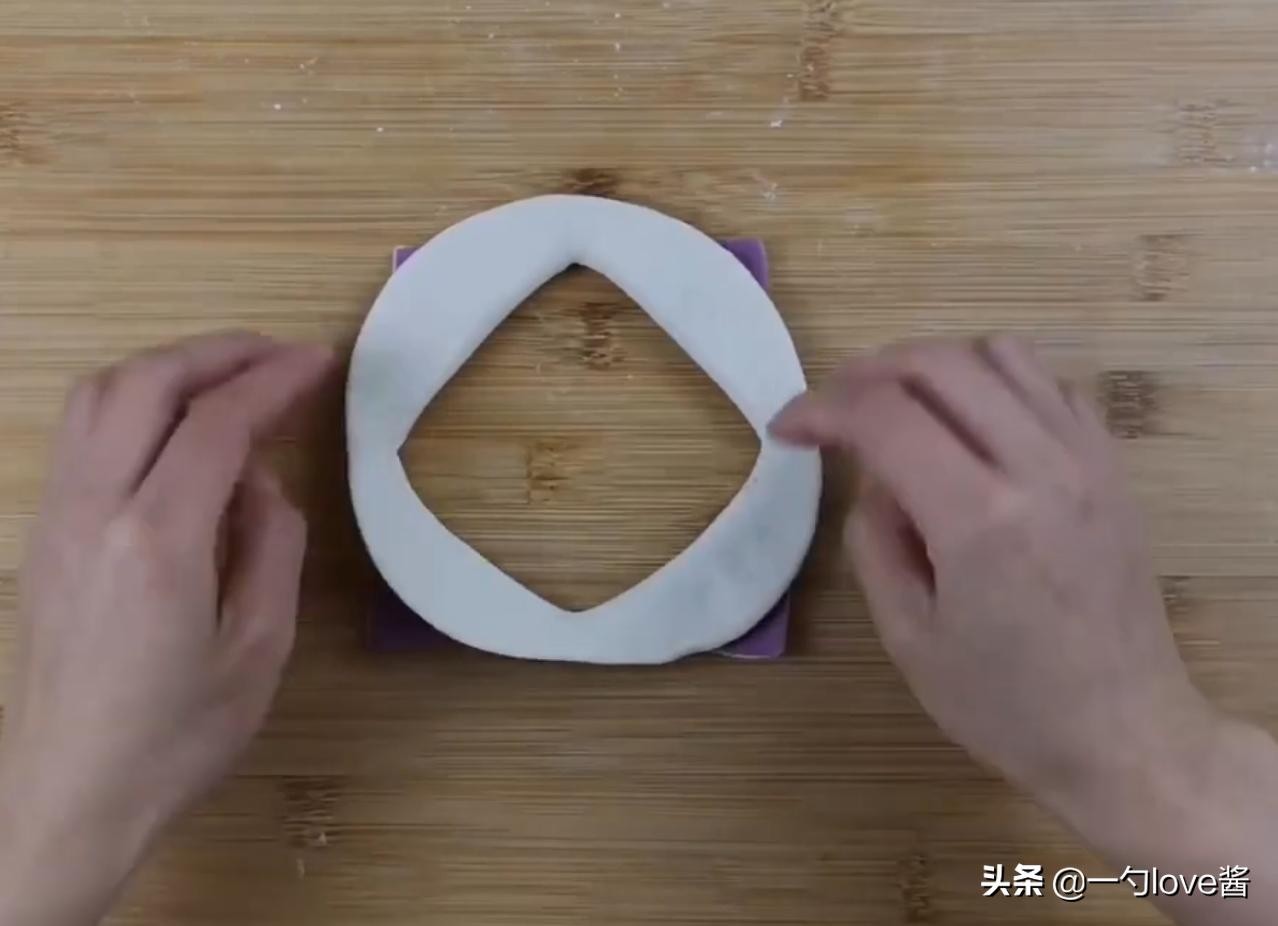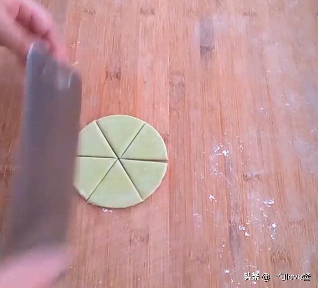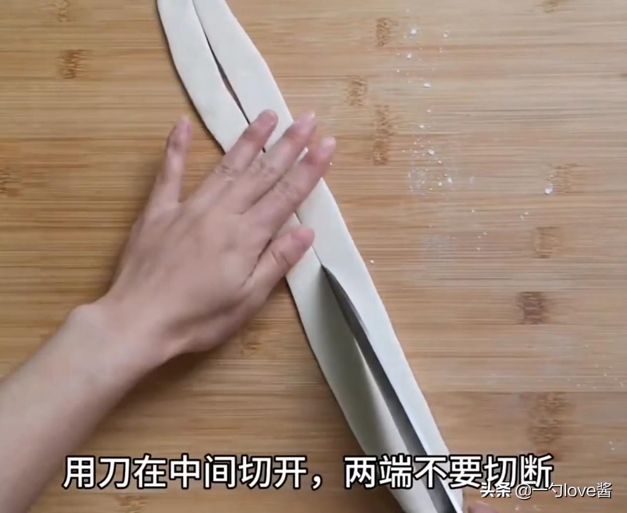 1.面团搓成长条,再擀薄,然后用刀从中间切开,两头不切断。