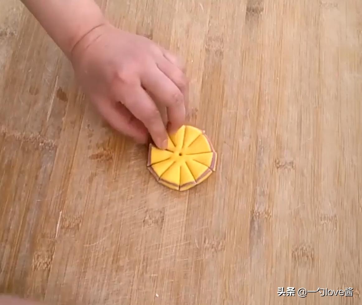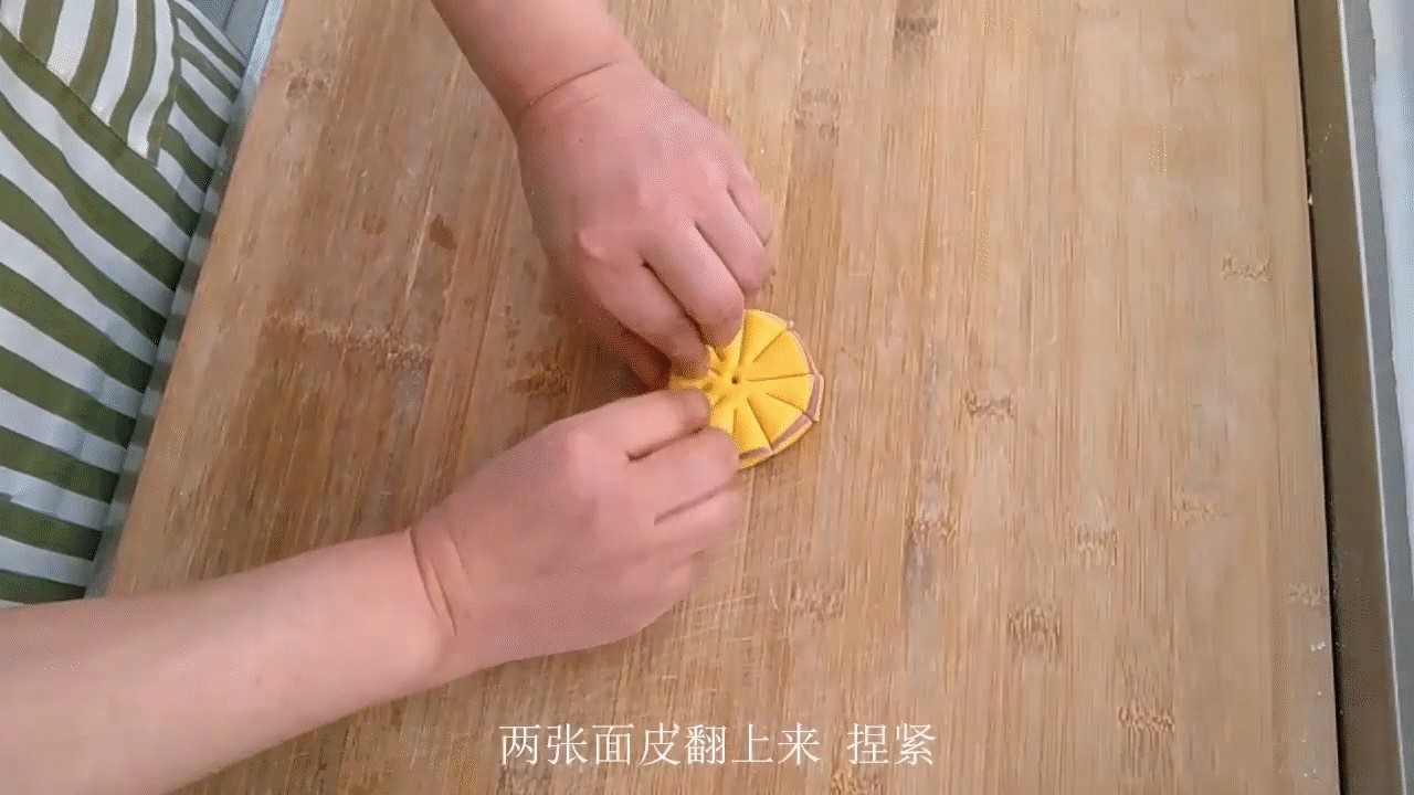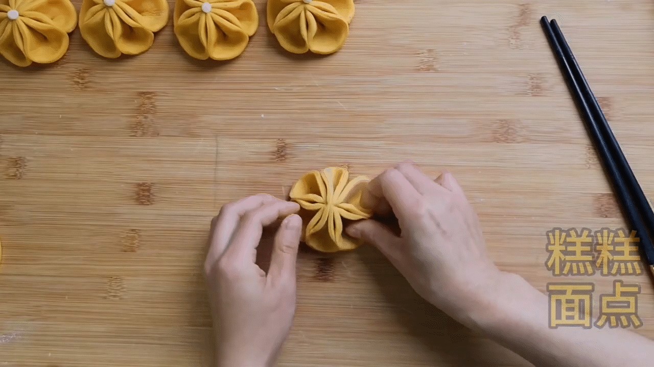 5.将8个压好花型的面片一个个错开叠放上去,然后用筷子使劲压一压。