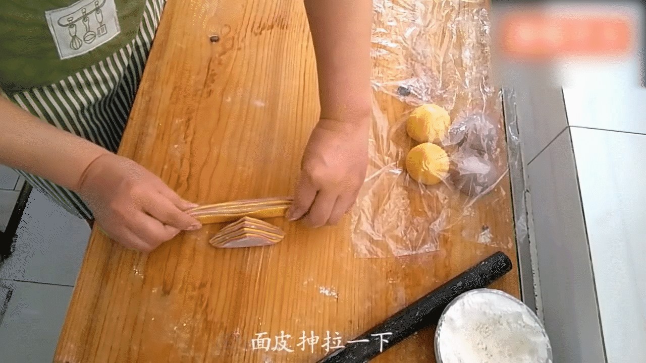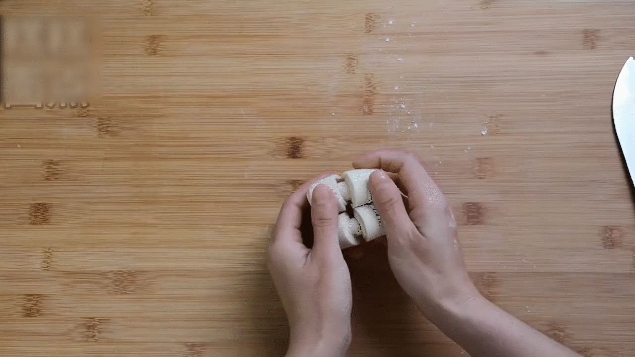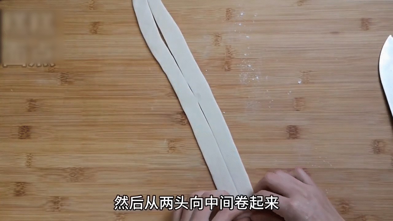 面团搓成长条——擀薄——中间切开,不切断(两头留点距离)
